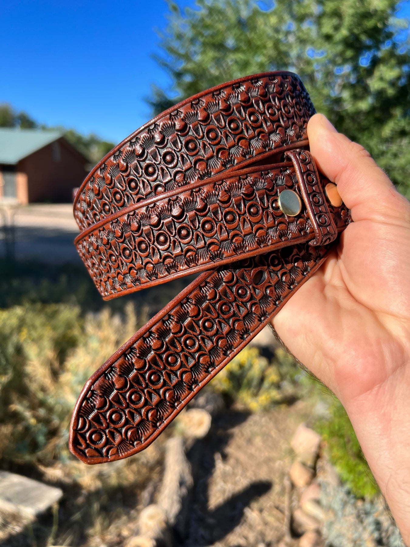 The Arabesque Belt is hand stamped using traditional saddle tools, no presses or machines are used.